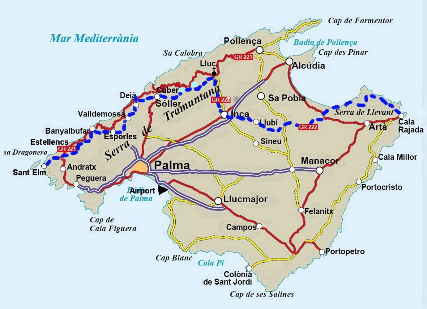 Desde el alojamiento, el sendero asciende directamente hacia la Mola d’Esclop, uno de los miradores más bellos del sur de Mallorca. La ruta continúa hacia la costa, hasta Estellencs. Si prefiere no subir a la Mola d’Esclop, puede optar por la ruta de dificultad moderada.